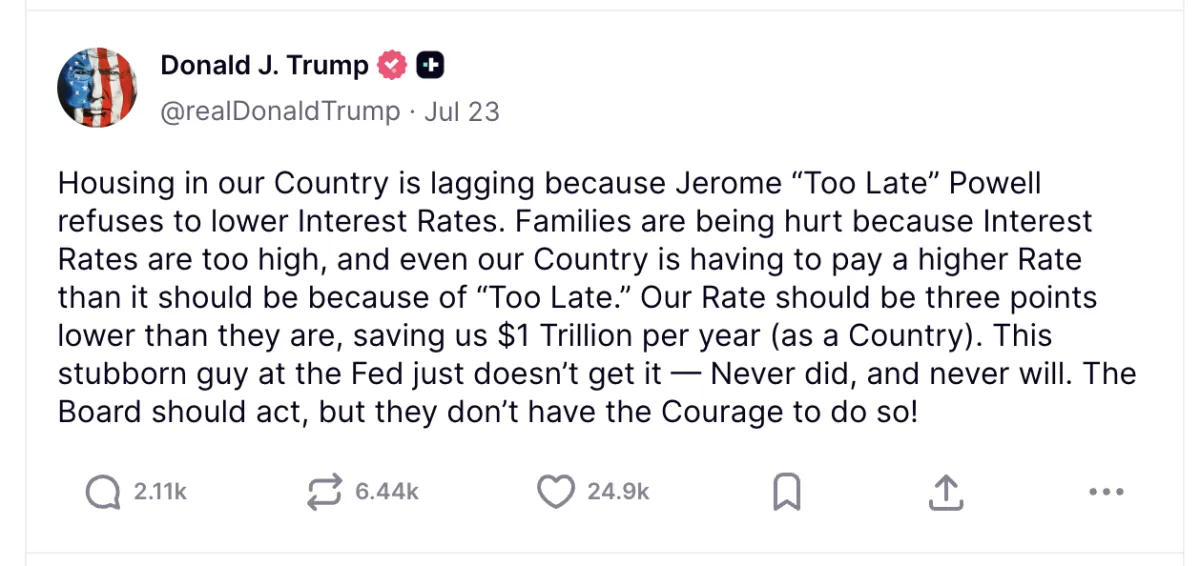 Powell has just over a year left on his term. Trump has already signaled his intention to install allies more aligned with his pro-growth, pro-rate-cut agenda. Names like Stephen Miran and Kevin Hassett have circulated as potential Fed board picks—candidates who would likely push for lower interest rates sooner rather than later.
